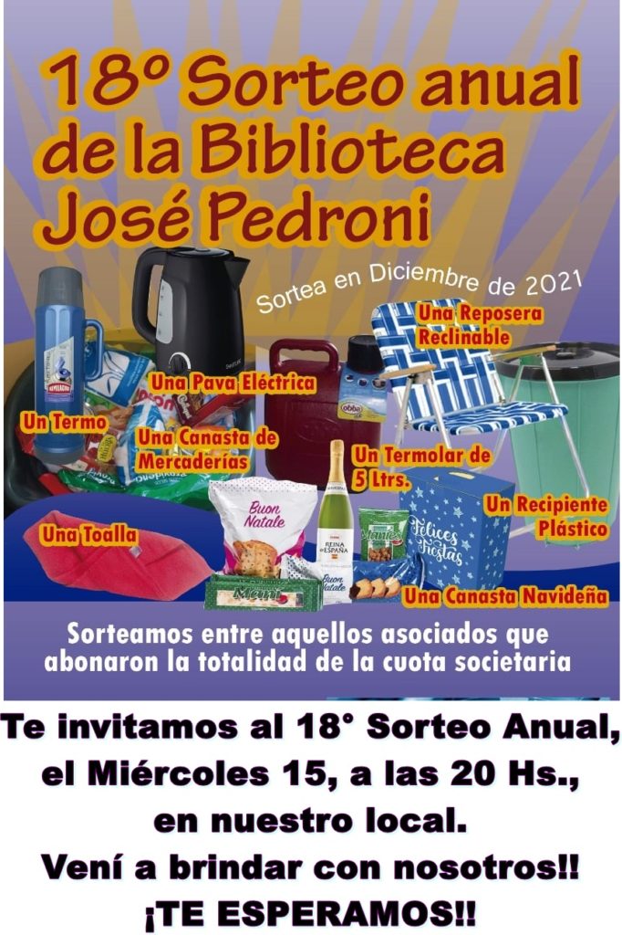 Este Miércoles 15 de Diciembre, a las 20 Hs., en la Biblioteca José Pedroni se realizará el 18° Sorteo Anual entre aquellos Asociados que abonaron la totalidad de la Cuota Societaria del Año 2021. En el mismo se servirá un brindis a los asistentes, como habitualmente se hace, como forma de agradecer el acompañamiento de …